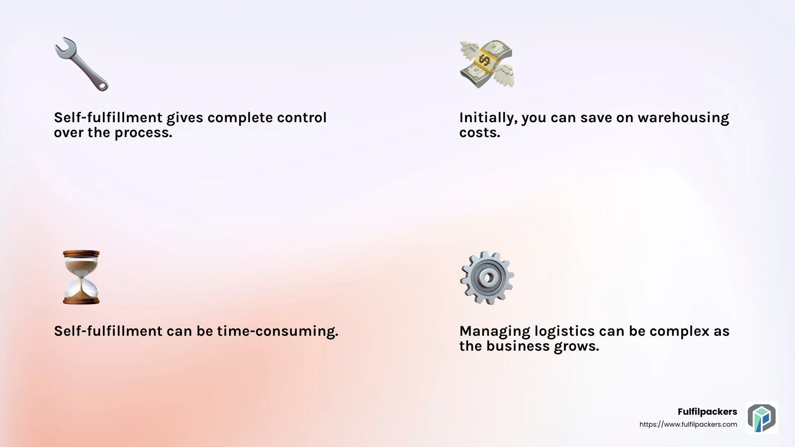 Self-Fulfillment: While manageable for startups, self-fulfillment can become increasingly challenging as order volume grows. You may need to invest in more space, staff, and technology to keep up.