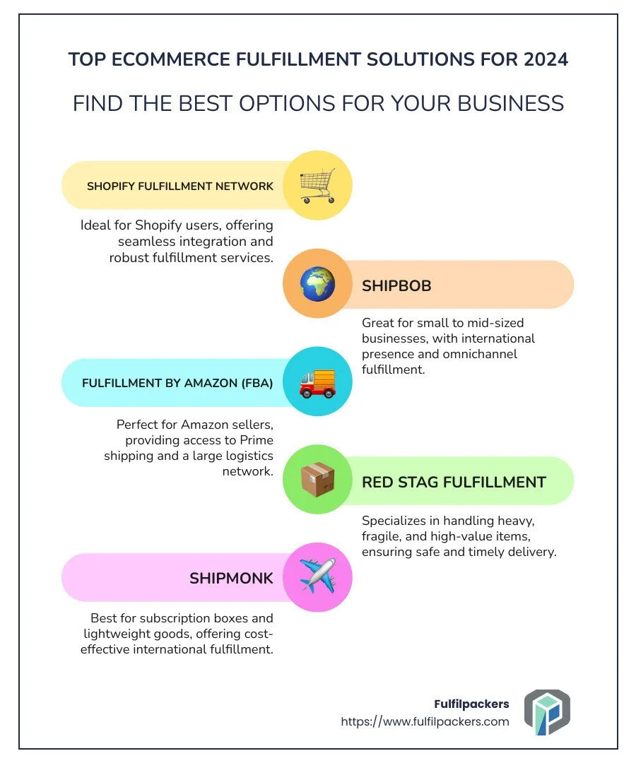Next, we’ll dive into the top eCommerce fulfillment solutions for 2024, highlighting their unique features and benefits to help you make an informed choice.
